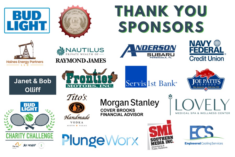 The annual Bud Light Charity Challenge Tennis Tournament benefits ARC Gateway, an organization that provides the best possible life experiences for more than 800 children and adults with intellectual and developmental disabilities, and Pensacola Sports, a private 501(c)3 non-profit agency that focuses on education, inspiration, and participation in various team, individual, amateur and professional sports, and activities.