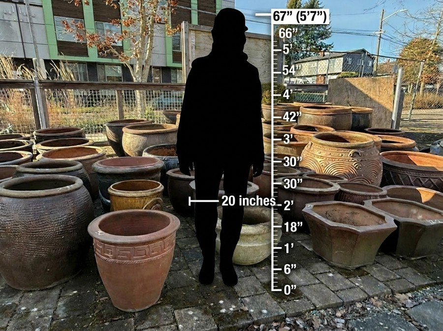 These are salvaged architectural quality pieces, most of vitrified stoneware type clay, there are some small dings from use, but their overall quality is excellent, and will be a great addition to any garden or deck. Planters range from midsized, suitable for seasonal accent planting, to large enough to be able to hold a small tree or shrub.