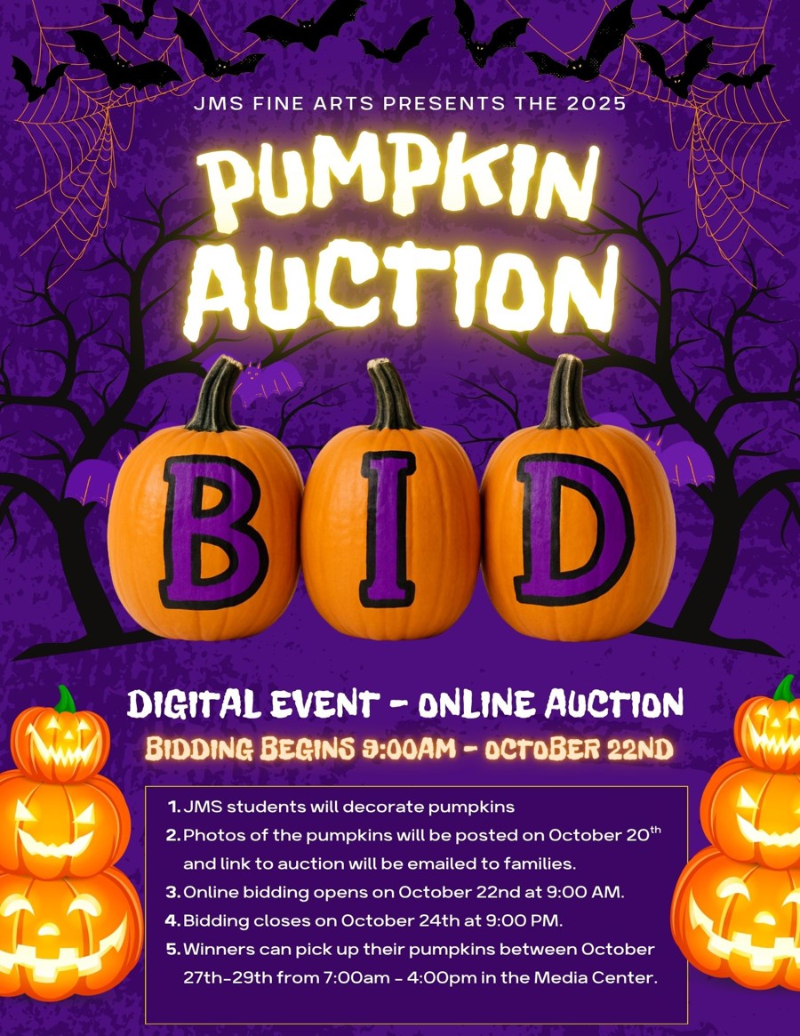 Welcome to the JMS Pumpkin Auction page. The online auction opens on October 22 and closes on October 24. Bids are in increments of $5. Click the drop-down links to view all items in the auction. Auction winners must pick up their pumpkins after school on October 27, 28 and 29 at Jefferson Middle School Media Center from 3 to 4 pm. Thank you for supporting our JMS clubs.