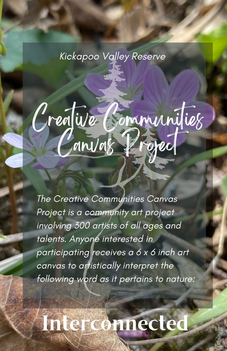 The Creative Communities Canvas Project is a community art project involving 300 artists of all ages and talents. Participants receive a 6-inch-by-6- inch art canvas to artistically interpret the following word as it pertains to nature: