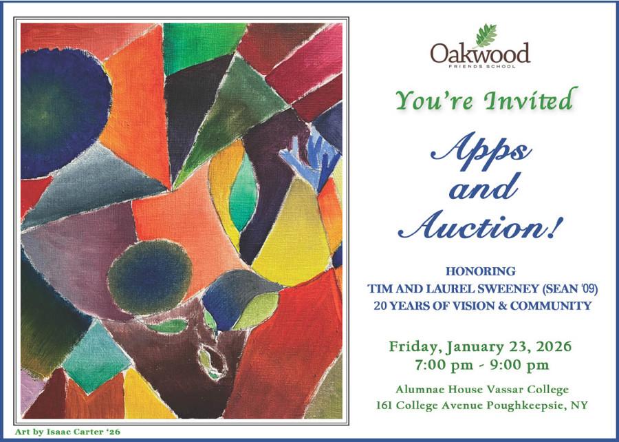 We warmly invite alumni, former parents, local friends, and members of the wider Oakwood community to join us at the Vassar Alumnae House on Friday, January 23 from 7:00 to 9:00 pm for Apps & Auction!
