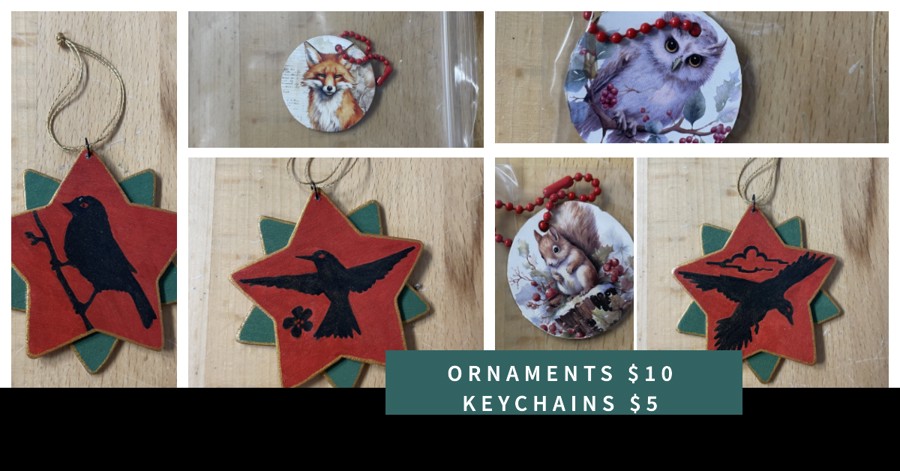 Support wildlife rescue with handmade ornaments by Volunteer Alynn Jackson and keychains from Volunteer Gail Verburg. Crafted with love, sold with heart. Every dollar goes further when we skip the fees!