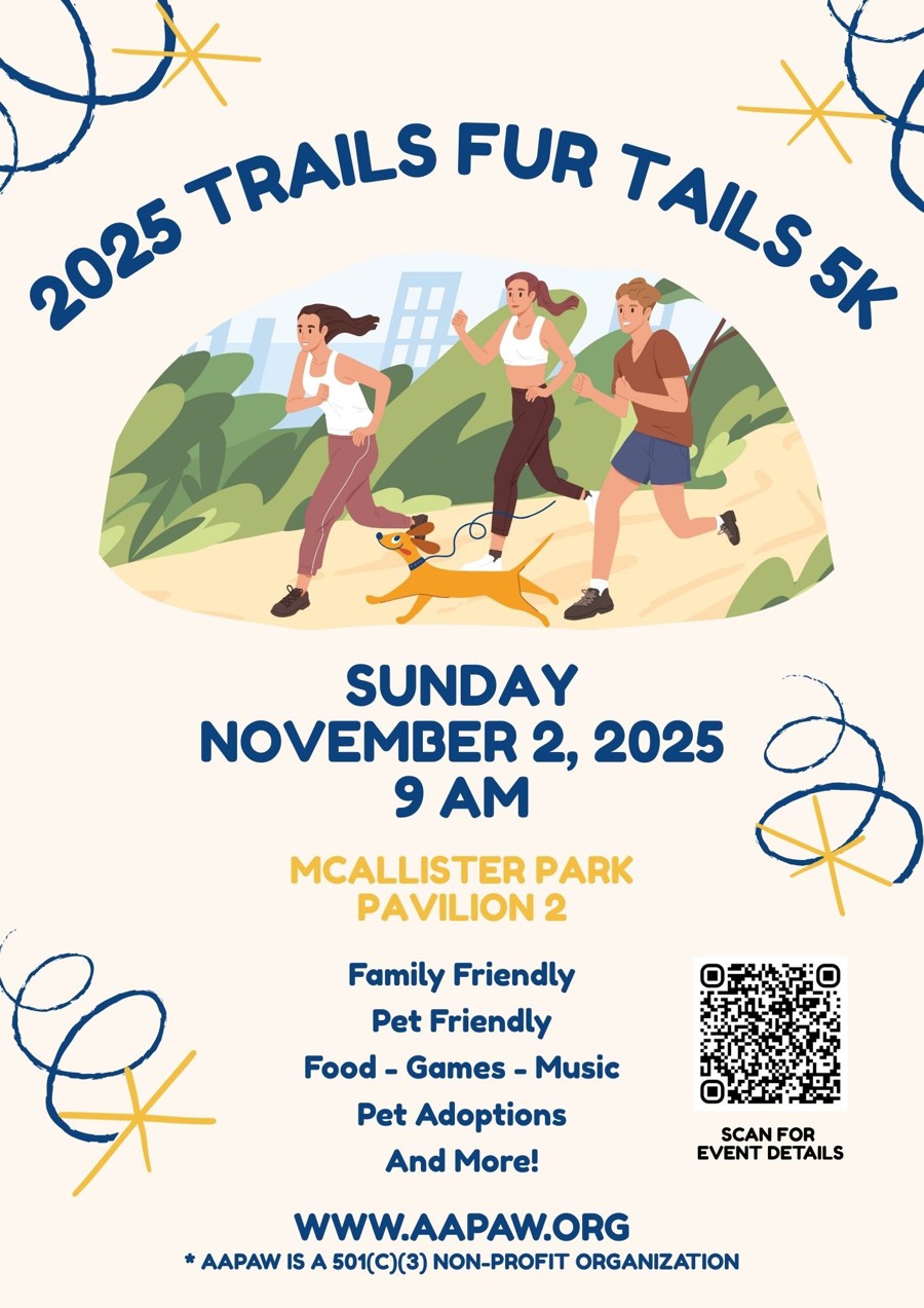 Welcome to our annual Trails Fur Tails 5K auction site! Our annual Trails Fur Tails 5K is a family friendly, pet friendly, run or walk 5K! Proceeds from this event and auction will benefit Alamo Area Partners for Animal Welfare (AAPAW).
