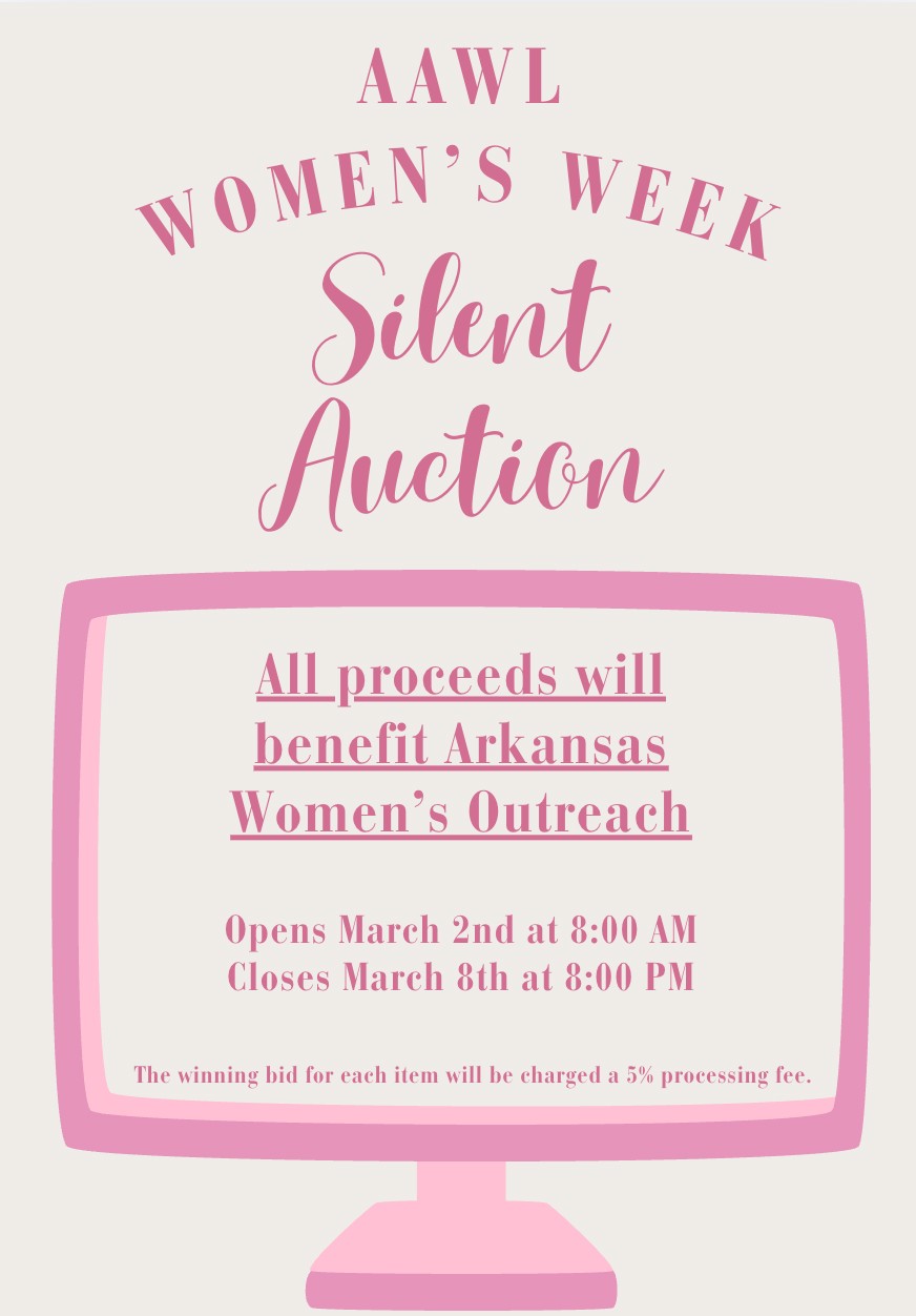 The Arkansas Association of Women Lawyers - Student Division is proud to host this year’s Women’s Week Silent Auction in support of an incredible cause. With your generosity, we are hoping to give even more than last year to Arkansas Women’s Outreach, an organization that makes a real and lasting impact in our community.