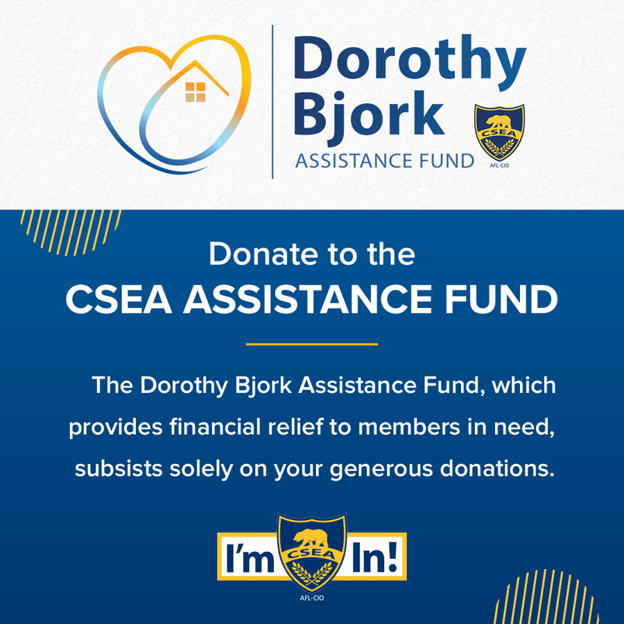 We are raising funds for the CSEA Dorothy Bjork Assistance Fund with an online auction. By bidding on an item or simply donating through the link here you can help a CSEA member in need of assistance. We thank you in advance for bidding or making a donation via the link above.