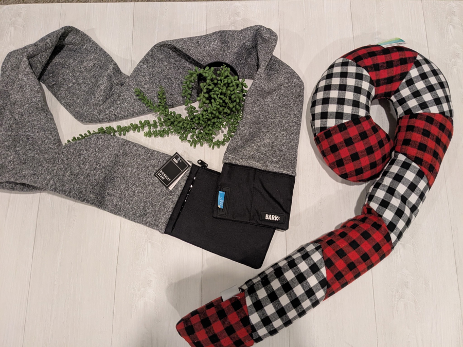 Keep cozy and stylish on walks with the Bark Big Walky Scarf in Gray/Black (84" x 6"), complete with a convenient pocket for pet poop bags. Also included is a festive holiday candy cane plush dog toy – perfect for some cheerful playtime! A huge thank you to PetSmart Towson for this generous donation!