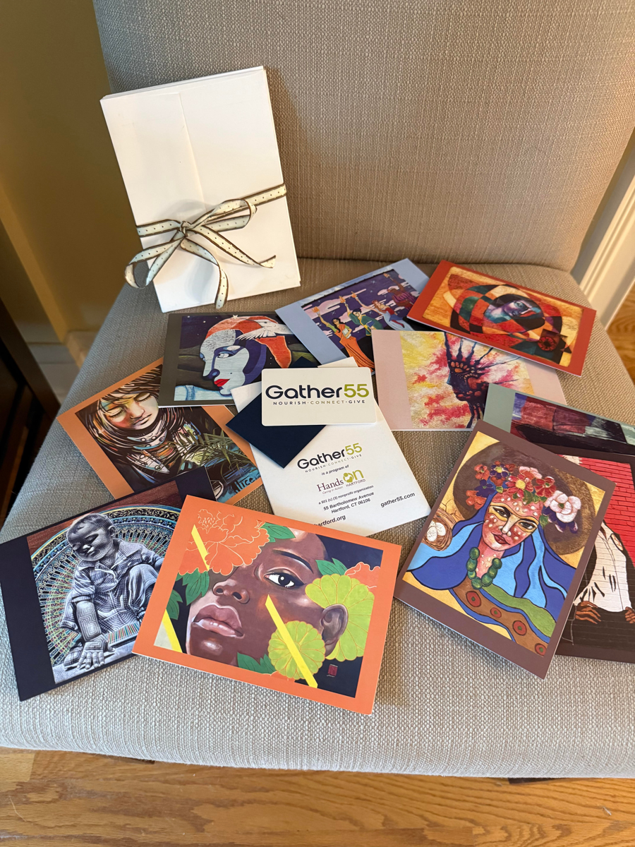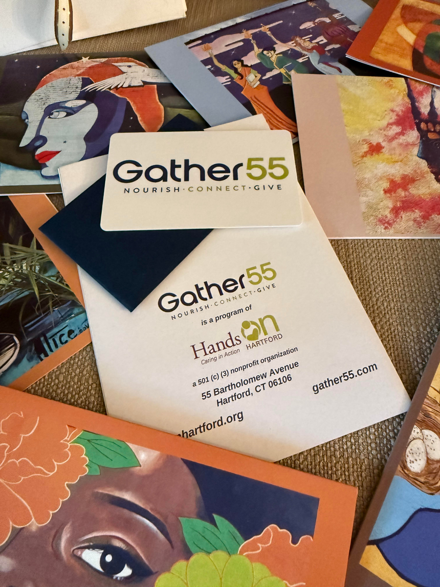 Gather55 is a restaurant and social enterprise of Hands On Hartford. It offers a daytime breakfast and lunch cafe, and an evening dinner restaurant with a three-course prix fixe menu. The seasonal dinner menu is created by rotating well-known local guest chefs who volunteer their time to this important endeavor. Also included with this auction item are 11 beautiful and unique note cards especially created for Hands on Hartford.