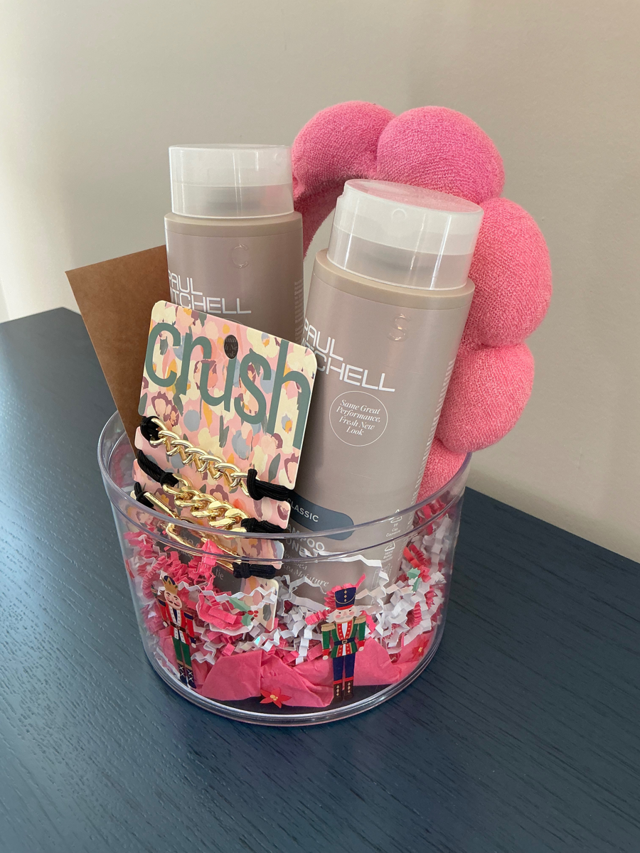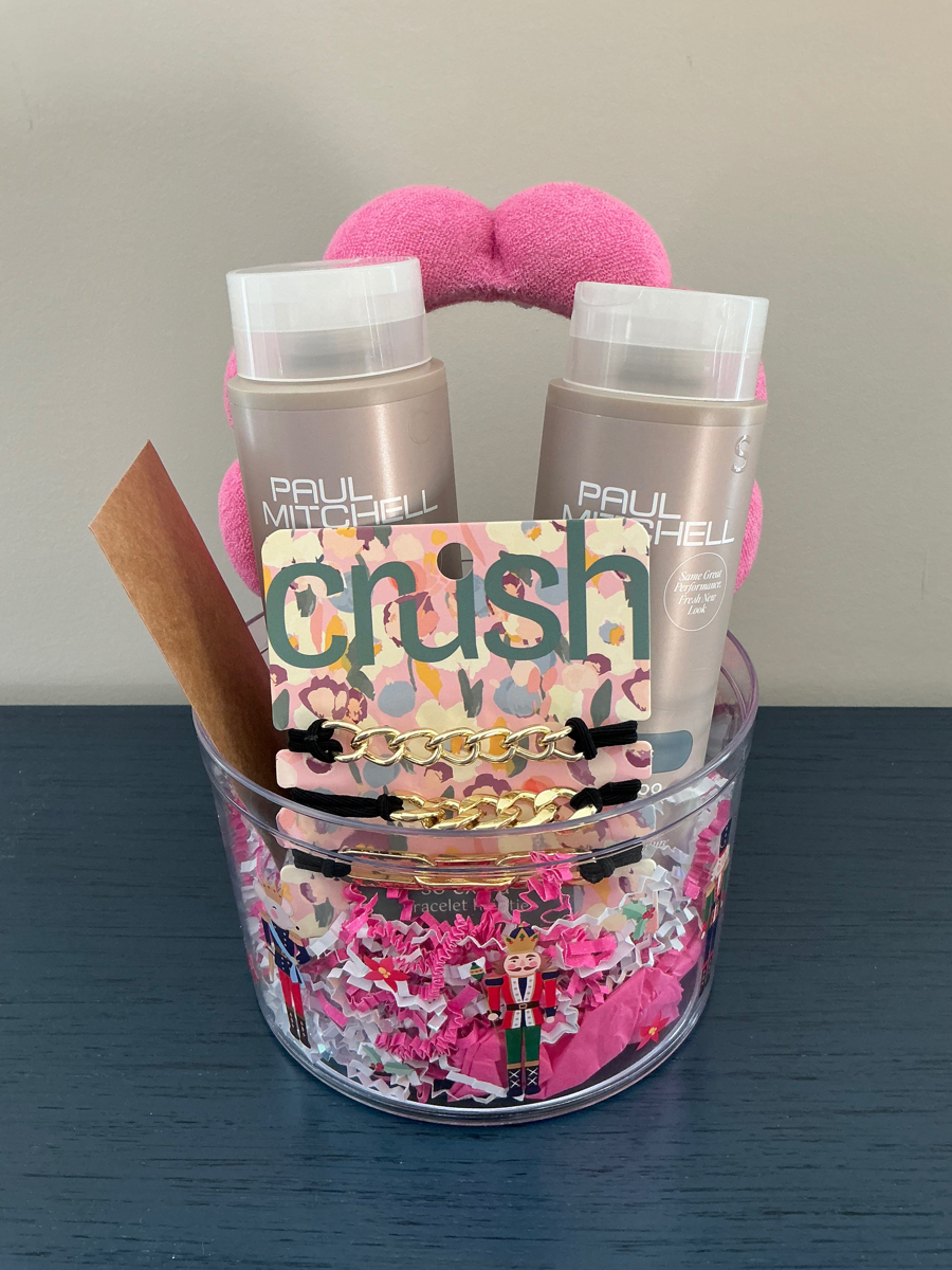 Get ready for the holidays! Gift basket includes: $100 gift certificate from Salon 81 in Higganum Paul Mitchell Classic Shampoo and conditioner Crush Bracelet Hair Ties Spa Head Band
