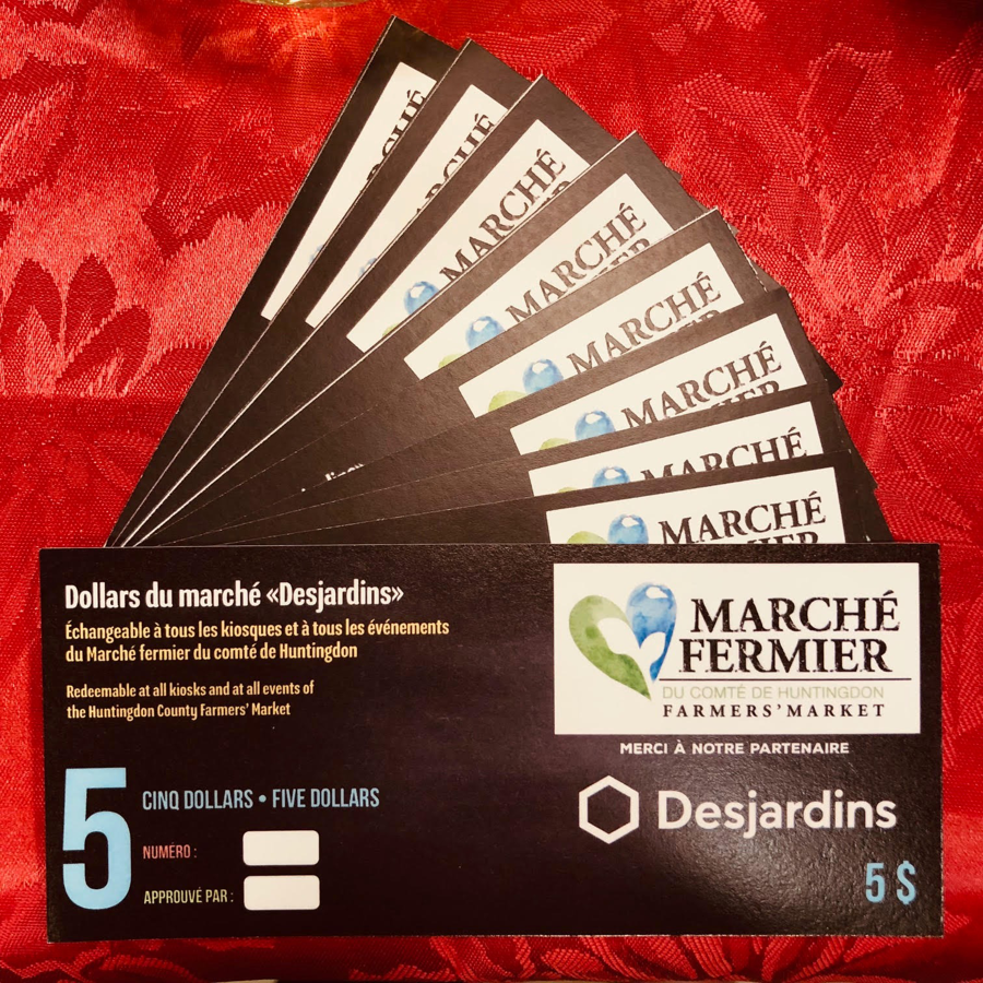 Redeemable at all kiosks and all events of the Huntingdon County Farmers' Market / Échangeable à tous les kisques et à tous les événements du Marché fermier du comté de Huntingdon.