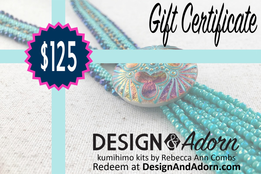 One $125 gift certificate to Design & Adorn's onlie store. Kits, supplies, Kumihimo, jewelry, and more!