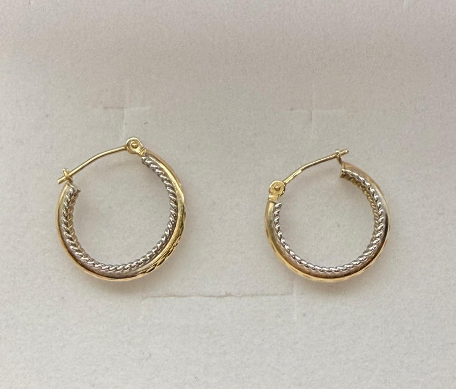 These are two-tone gold hoop earrings featuring a classic twisted or cable design. They have a snap-post hinge closure. The textured layer look has been seen in many affordable fashion alternatives but these are the real deal. They have been inspected by a local gemologist to determine value.
