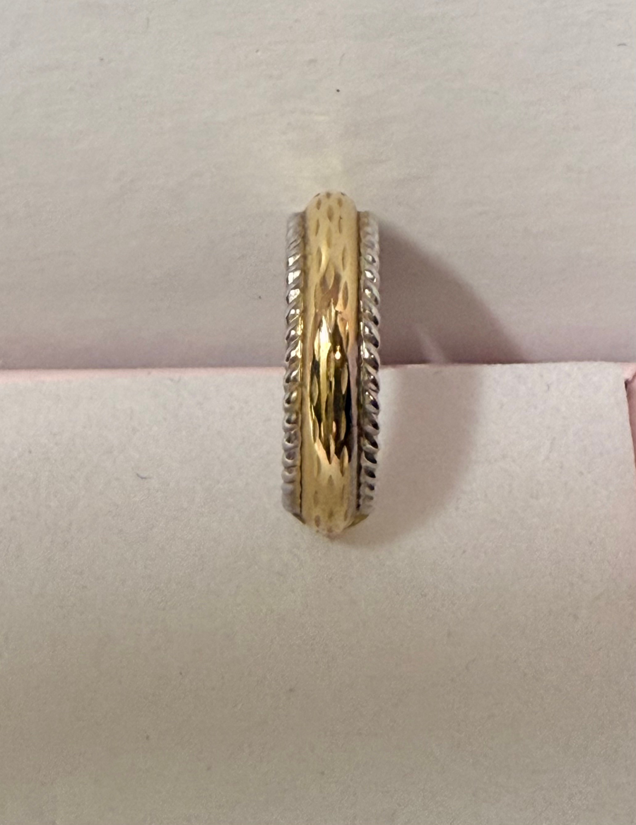 These are two-tone gold hoop earrings featuring a classic twisted or cable design. They have a snap-post hinge closure. The textured layer look has been seen in many affordable fashion alternatives but these are the real deal. They have been inspected by a local gemologist to determine value.