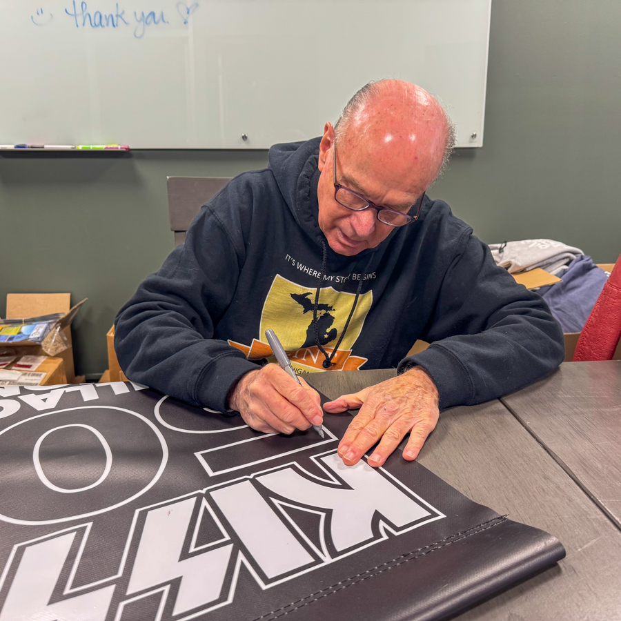 Own a piece of Cadillac KISStory! These authentic street banners were proudly displayed in downtown Cadillac during the KISS 50th Anniversary Reunion year in 2025, celebrating the band’s legendary 1975 visit that rocked our town and made music history. Featuring bold black-and-white designs and official event branding & signed by coach Jim Neff, who made the KISS visit to Cadillac possible. These limited-edition banners are the ultimate collectible for KISS fans and Cadillac locals alike. Authentic. Iconic. One-of-a-kind.