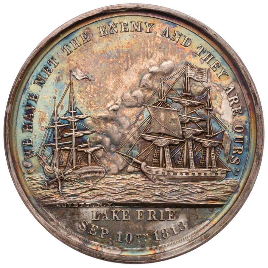 The Battle of Lake Erie, fought just 50 miles away from the ANS' new headquarters in Toledo, Ohio, was one of the most consequential American victories of the War of 1812. In 1860, the Kentucky legislature passed a resolution honoring the brave Kentuckians who helped secure the lake from British forces. When the medals were finally bestowed in 1867, however, only six of the original recipients were still living. This white-metal medal was designed by George H. Lovett (1824-1894) and measures approximately 1.6" in diameter. * Following the auction, winners will receive an invoice for their winning bid and shipping costs.