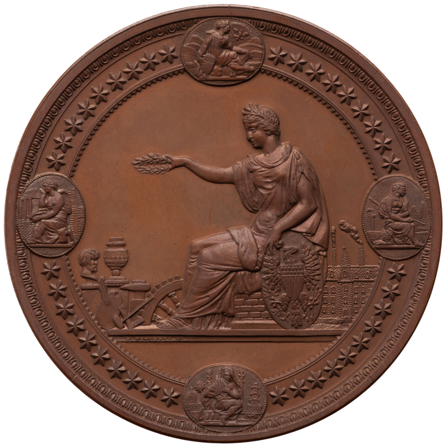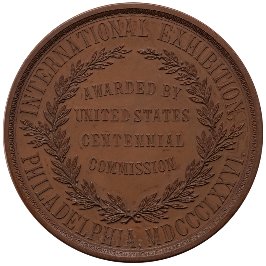 Philadelphia's Centennial International Exhibition (officially titled the International Exhibition of Arts, Manufacturers, and Products of the Soil and Mine) not only commemorated the 100th anniversary of the signing of the Declaration of Independence, but also marked the first World's Fair to be held in the United States. This 3" bronze medal was engraved by Henry Mitchell (1835-1916) and struck at the U.S. Mint. About 12,000 medals in total were awarded to exhibitors displaying innovation and originality, design and craftsmanship, practical utility, and scientific achievement. * Following the auction, winners will receive an invoice for their winning bid and shipping costs.