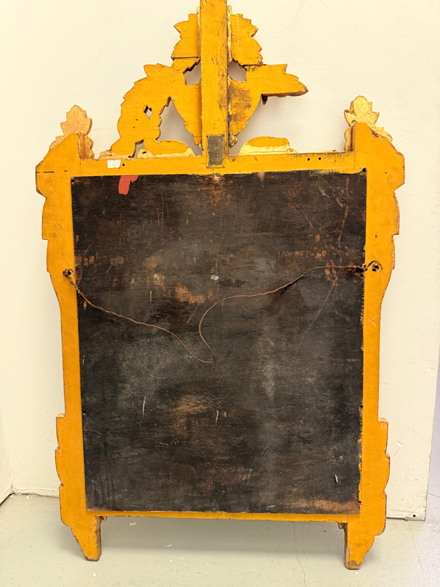 This is a French Louis XVI period giltwood mirror from the 18th century, around 1780. The frame is made of carved giltwood wood. The crest features a carved bouquet of flowers falling from an urn or basket, flanked by carved foliage common for the era. The mirror has a rectangular shape with decorative carvings in the corners and fluted stiles. The frame is made of carved wood and features a gilt finish that shows some wear, revealing red undertones. The red layer underneath is typical for antique items. An interesting fact is that mirrors like this were given as wedding gifts and placed in a bridal chest dating back to the 1600s. The worn gilding adds character and there are some repairs to be expected on this old and treasured item. Note: the top of the frame has been broken and the price reflects the imperfection. *see photo Photos do not give this special piece the justice it deserves. Come visit the store and view in person during the auction period.