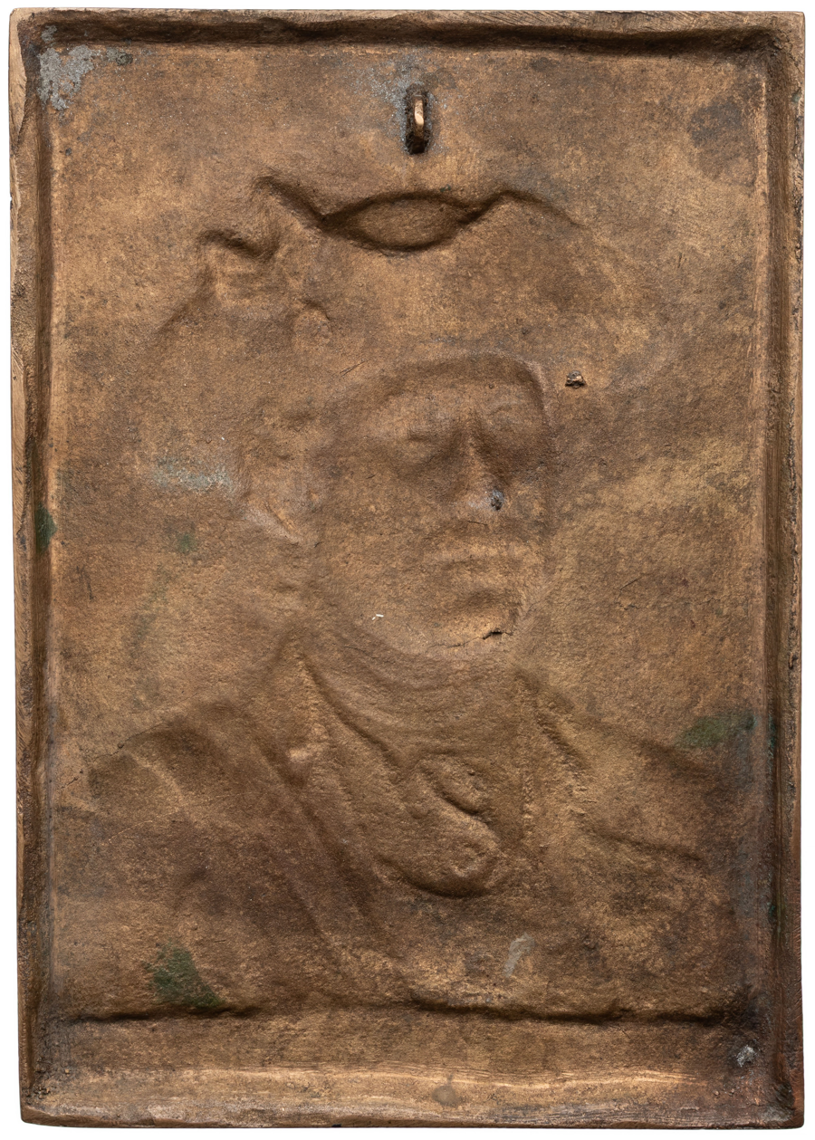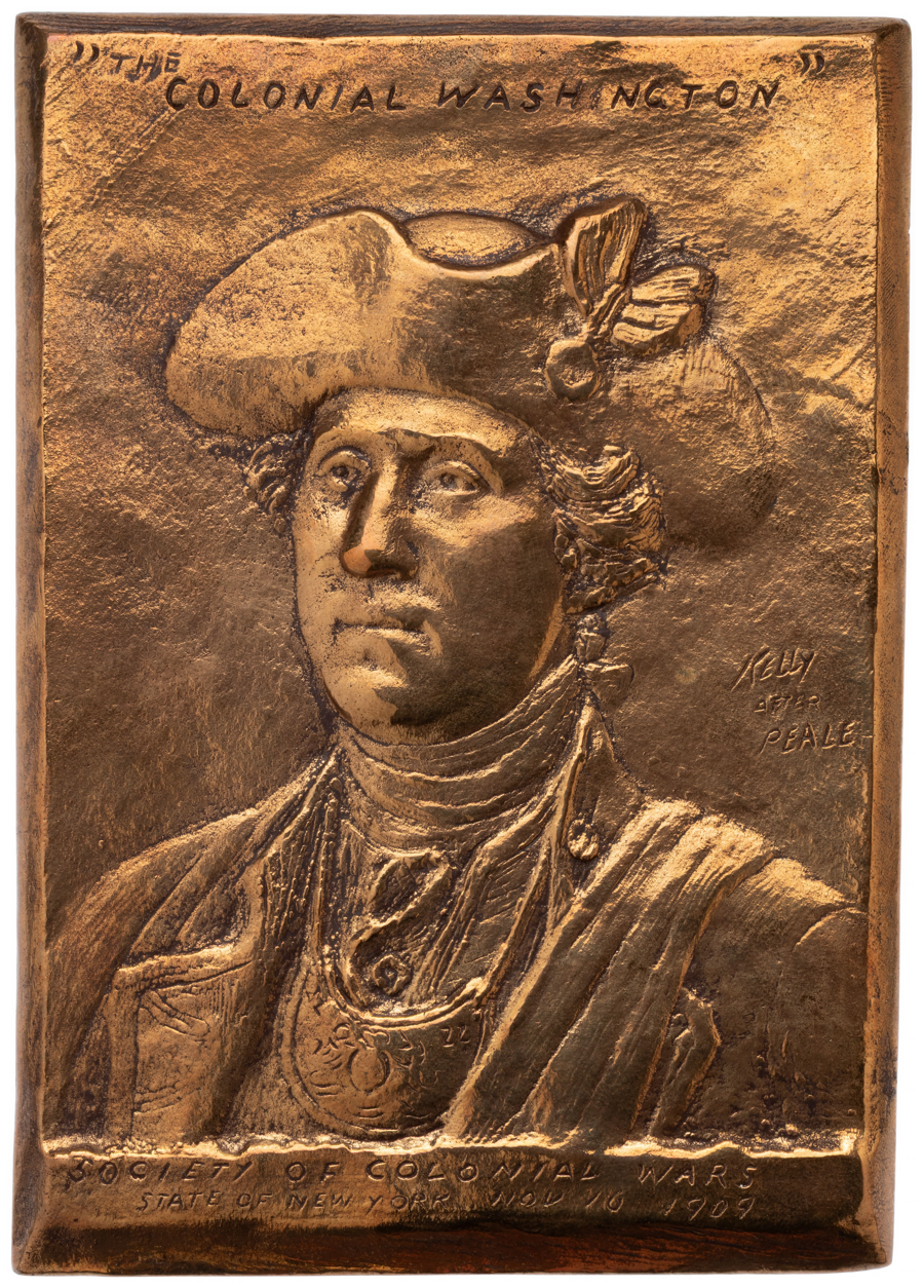 Issued in September of 1909 by the Society of Colonial Wars, "The Colonial Washington" plaquette has proven to be elusive today. Sculpted by James Edward Kelly, this rendition of George Washington is after the painting by Charles Willson Peale at Mount Vernon in 1772. Today, perhaps no more than a dozen of these cast plaquettes are known to have survived, with the most recent sold by Stacks Bowers Galleries in November of 2025. 130mm x 91mm.* Following the auction, winners will receive an invoice for their winning bid and shipping costs.
