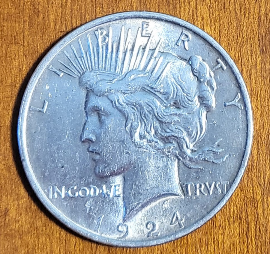 A great investment, this 1924 Peace Silver Dollar is in very good condition. With recent increases, the value of the silver in this coin is around $42! Comes in protective plastic sleeve. This auction also includes a 1921 Liberty Silver Dollar.
