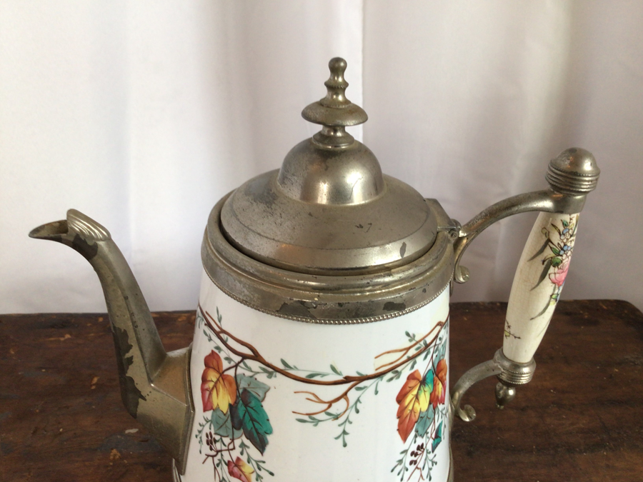 Leaf design, late 19thc granite wear tea or coffee pot- stands 9” x 9.75” Handle has slight yellowing and metal is flaking,