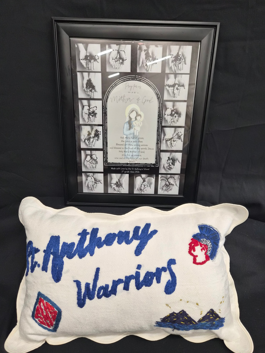 Framed picture of all 2A students holding the beloved blessed rosary in a black and white portrait. surrounding a picture of Mary the of God drawing , Along with a beautiful hand crafted "St. Anthony Warrior" Pillow. A perfect gift for your home, to be cherished and remembered. Items: Mary Mother of God Portrait and an embroidered pillow case