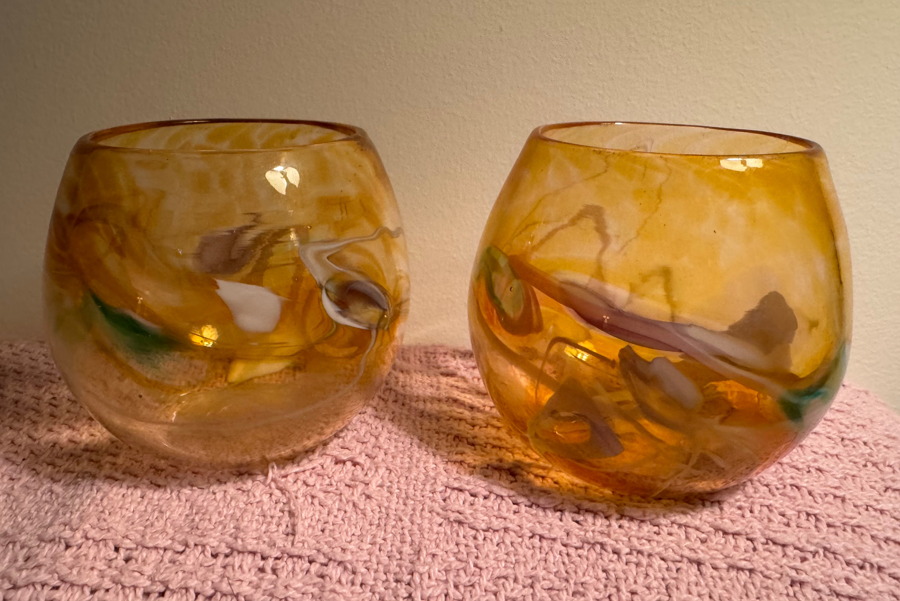 These 9-cm tall glasses were created by Laurie's sister-in-law, Loretta Forde, who lives in the Blue Ridge Mountains in NC with her husband David Wilson. Both Loretta and David have been glass-blowers for many decades.