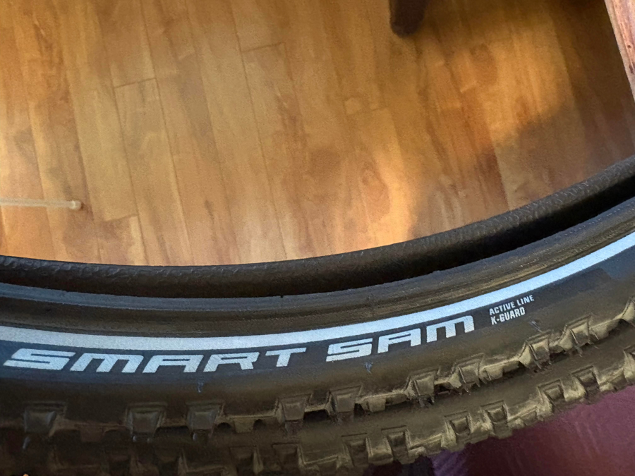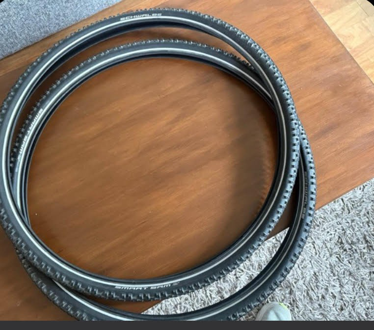 One pair gently used Schwalbe Smart Sam bike tires with Active K Guard. (KGuard = Kevlar place under the tire tread to reduce risk of flats) . Good for e-bikes used for commuting or on mixed terrain. Size: 700x42 ( aka 28 X1.65 )