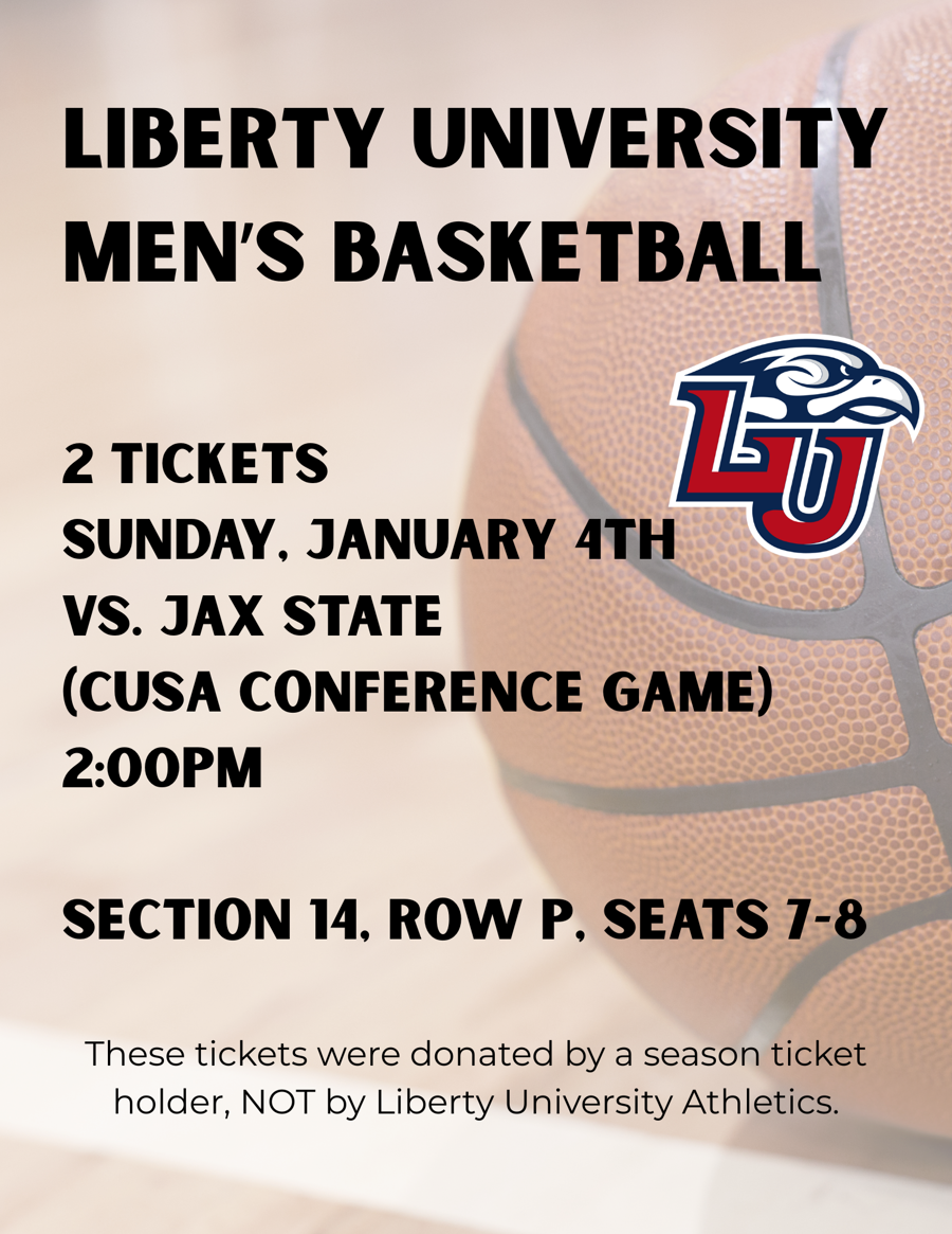 2 tickets to Liberty Men's Basketball, January 4th CUSA Game vs Jacksonville State, 2pm Digital download, will be sent directly to the winner via preferred email or phone number for download.
