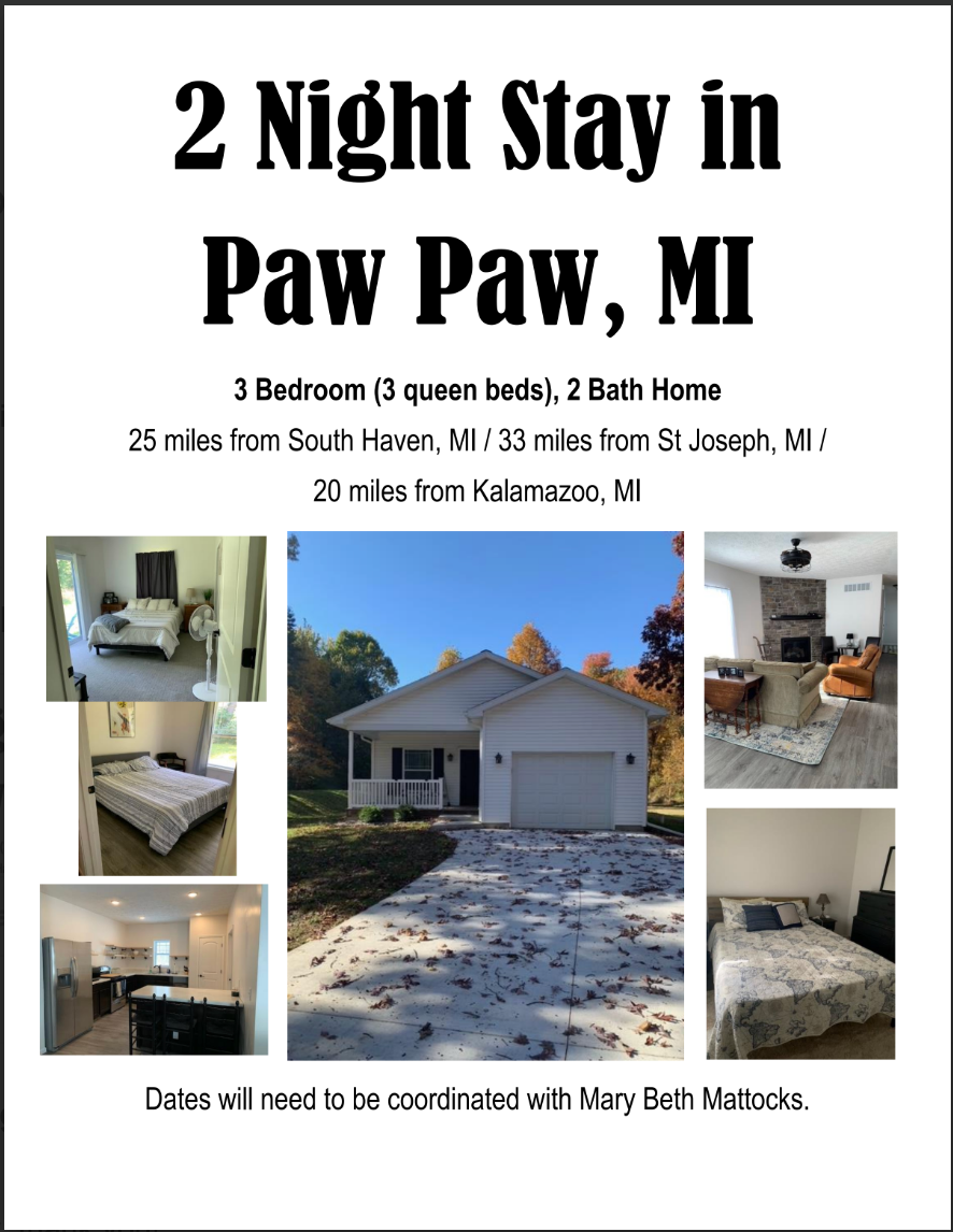 Experience a relaxing getaway with a 2 Night Stay in Paw Paw, MI at a charming lake house. This exclusive auction item, generously donated by Dean and Mary Beth Mattocks, offers you the perfect opportunity to unwind and enjoy the beauty of Michigan's serene landscapes. Whether you're looking to fish, swim, or simply relax by the water, this lake house provides a peaceful retreat. Don't miss your chance to bid on this wonderful experience in Paw Paw!