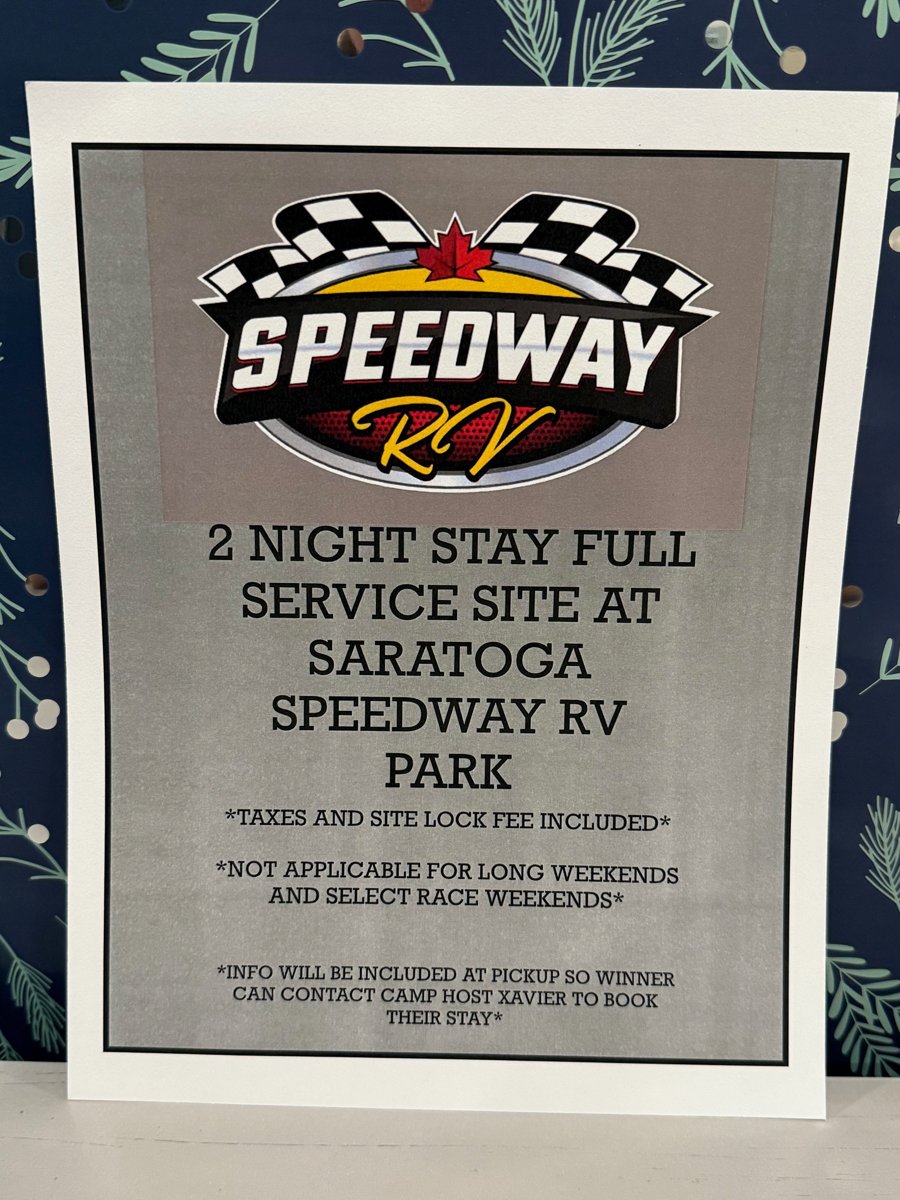 Package #2 Experience a memorable 2 Night Stay at Saratoga Speedway RV, where you can enjoy full service camping. This prime location offers easy access to beautiful beaches, exciting mini golf, and the thrilling racetrack, ensuring a unique and enjoyable getaway tailored just for you. Please note that this offer is not applicable for longer weekends and select race weekends. Don't miss this chance to create lasting memories in a fantastic setting! Donated by Saratoga Speedway RV
