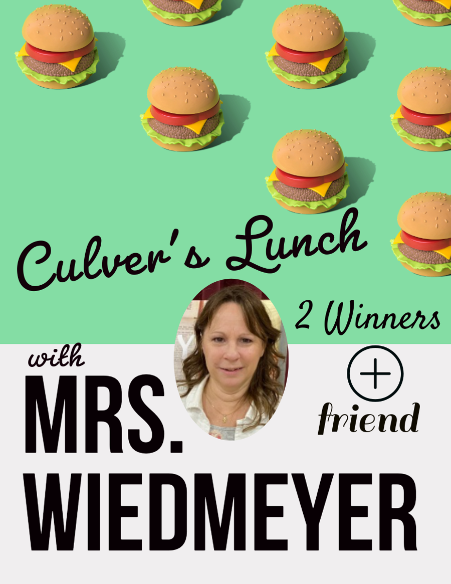 Bid to win an opportunity to have lunch with Ms. Wiedmeyer! Two winners will enjoy a delicious Culvers lunch with Ms. Wiedmeyer and a friend of their choice. Don't miss out on this unique opportunity to share a meal and conversation with a beloved educator! (one winner per item number)