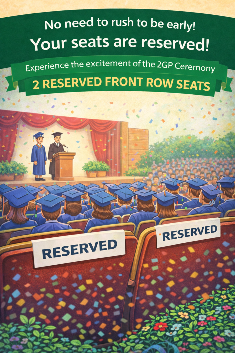 No need to rush to be early! Your seats are reserved! Experience the excitement of the 2GP Ceremony with 2 reserved front row seats. This is your chance to be at the heart of the action, enjoying every moment from the best vantage point.