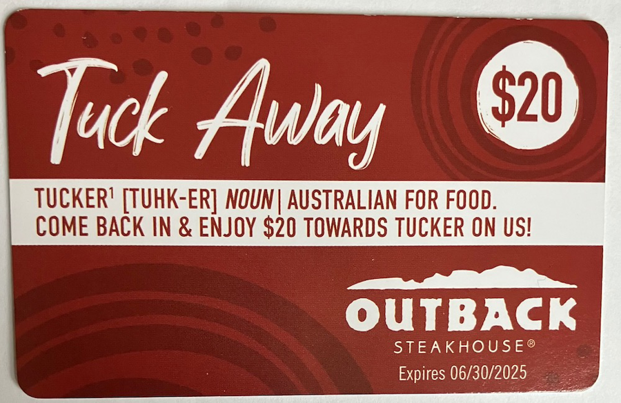 Two Tuck Away cards, valued at $10 each, EXPIRE 6/30/2026 and cannot be used toward gratuity, tax, or alcoholic beverages. https://www.outback.com/