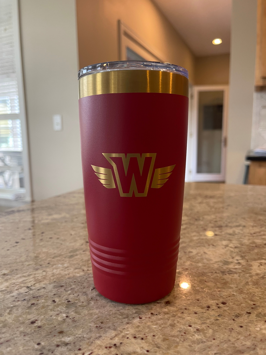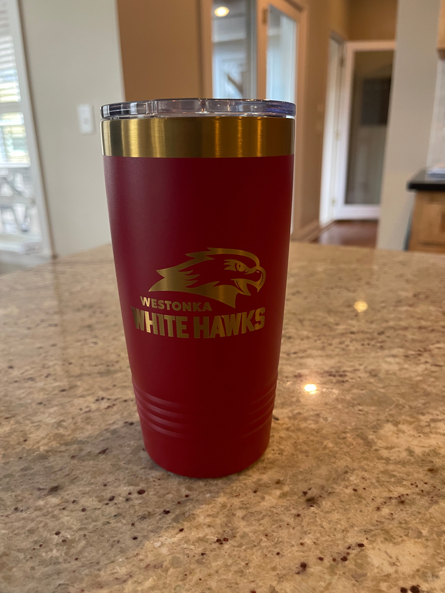 20oz Red/Gold Tumbler Engraved with Westonka White Hawks logos on both sides!