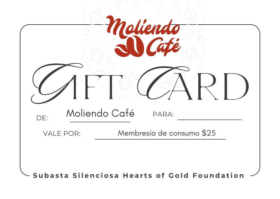A perfect gift for coffee lovers and fans of Colombian food! Bid on this Gift Card from Moliendo Café, an ideal spot to enjoy high-quality coffee, delicious desserts, and a cozy atmosphere. Prize Details Prize: Consumption membership/credit valued at $25 (twenty-five dollars). Use: The value can be used as credit to purchase any product on Moliendo Café's menu. Donated by: Moliendo Café Español: ¡Un regalo perfecto para los amantes del café y de la comida colombiana! Puja por esta Gift Card de Moliendo Café, un lugar ideal para disfrutar de café de alta calidad, deliciosos postres y un ambiente acogedor. Detalles del Premio Premio: Membresía de consumo con un valor de $25 (veinticinco dólares). Uso: El valor puede ser utilizado como crédito para consumir cualquier producto en el menú de Moliendo Café. Donado por: Moliendo Café