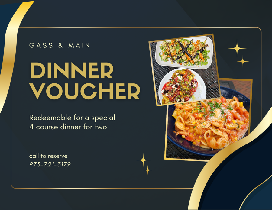 Introducing Gass & Main, a unique New American BYO experience crafted by Chef Dane DeMarco. The winner of this item will receive a $250 gift card redeemable for a 4-course dinner for two at Gass & Main in Haddonfield, NJ. Immerse yourself in a culinary journey where seasonal flavors meet local and sustainable ingredients, showcased through thoughtfully curated menus for both dinner and brunch, served five days a week. Step into an ambiance that tells a personal story – adorned with antique American farm tools handpicked from the walls of Chef Dane's childhood home. At Gass & Main, they blend culinary excellence with sentimental touches, inviting you to savor not just a meal, but a delightful experience rooted in love, passion, and a commitment to quality dining. The restaurant's name pays homage to the cross streets where Chef Dane and their spouse gathered with their wedding party, marking the beginning of a beautiful journey that led them to tie the knot in Las Vegas. Image Description: Photos of 3 plated dishes with the text “Dinner Voucher.”