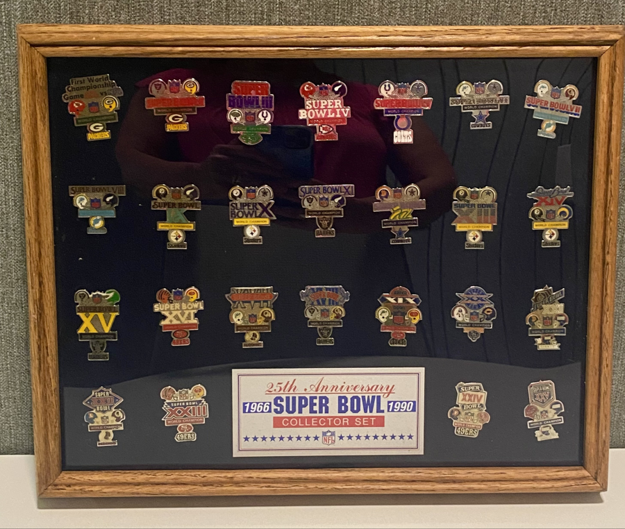 Framed 12x15 25th Anniversary Superbowl pin collection. This item cannot be shipped.