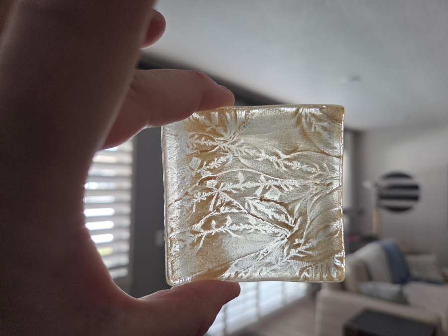 This exquisite 2.75"x2.75" Gutter yellow colored glass trinket dish is a stunning addition to any collection. Crafted with care, it showcases the artistry of 1 Krafty Lady, making it a unique piece that stands out. Perfect for holding small treasures or as a decorative item, this glass dish combines elegance and functionality. Don't miss the chance to own this beautiful piece of craftsmanship that highlights the charm of mauve-colored glass. The bracelet is not included, it is just for size comparison.