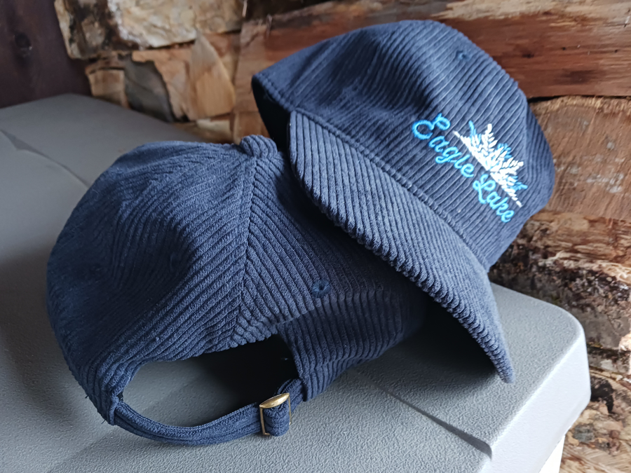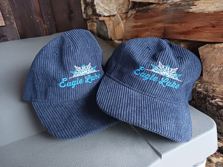 Two lightweight, blue corduroy hats. Embroidered with "Eagle Lake". Adjustable strap with buckle.