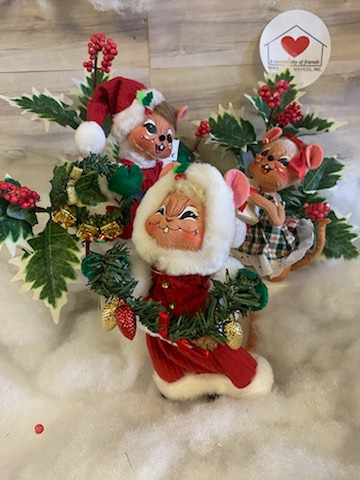3 vintage Christmas brown mice 1 with a wreath, 1 with a garland, and one with a package are only running after Santa not a farmer.