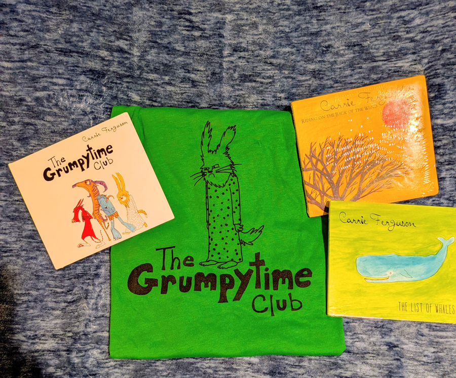 Auction Item: 3 CDs by Artist Carrie Ferguson and Grumpytime Club T-shirt CDs included: The Grumpytime Club (2021, for kids and families), The List of Whales (2013, for adults), and Riding on the Back of the Wind (2010, for adults). T-Shirt is size Small Donated by: Carrie Ferguson Carrie Ferguson (they/them) grew up playing an enormous, upright, chocolate-brown piano inherited from the family of one of Carrie's father’s third grade students. This piano, built from the parts of several old pianos by students in a local instrument-building workshop, had a darkly booming, slightly furry quality to it, not unlike the weather outside in Carrie's hometown of Arcata on the North Coast of California. In order to write good music, the piano had to be played the way the instrument itself demanded, which to Ferguson’s ear meant sticking to the lower two-thirds of the keyboard and using plenty of rolling arpeggios and minor chords. Ferguson credits the stubborn and sonorous voice of that childhood piano, combined with the perpetual fog and exhilarating clamminess of coastal Northern California, as instilling in the baseline aesthetic of melancholic optimism that still permeates their words and music. Currently living in Northampton and Wendell, MA, Carrie Ferguson’s original songs range from playfully jubilant and whimsical, to soaring pop, country-tinged folk, and straight up rock. Ferguson’s band, a rotating squad of players from the Pioneer Valley, uses a shifting palette of instruments and voices to create live shows that are joyful affairs, full of humor and warmth, beautifully showcasing their haunting melodies, and smart, gorgeous lyrics. Ferguson’s numerous awards include a Gold Award in the 2020 Mid-Atlantic Songwriting Contest and First Place in the 2020 New England Songwriting Competition for “Tavi’s Song.” The New England Songwriting Competition honored “Cat and Piggy” as a finalist in 2019, and “Wooden Nickel” from Ferguson’s Americana album, The List of Whales, was a finalist in the New England Songwriting Competition in 2017.