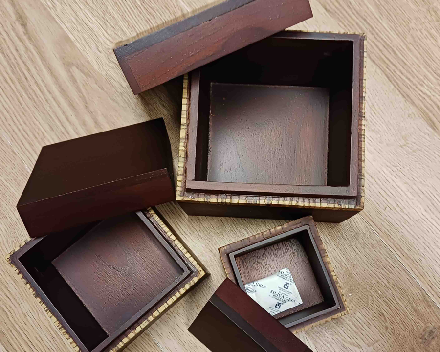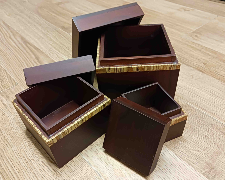 You are bidding on 3 nested boxes - mahogany stained Very gently stored but biggest box has a scuff or two - only in one corner. These are great for elegantly storing small items! The biggest box is 13 cm x 13 cm x 11 cm high