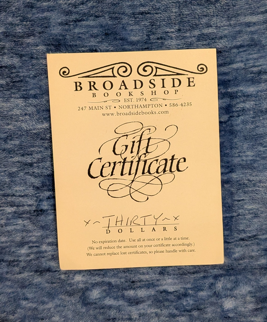Auction Item: $30 Broadside Bookshop Gift Certificate Donated by: Broadside Bookshop An Independent Bookstore since 1974. Located in Northampton, MA