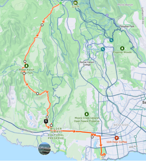 You and 4 friends will join Mischa and Max for a 3-hour (8 miles) bike ride from Twin Gates (on Empire Grade) through Wilder Ranch to Natural Bridges State Park. We’ll have a little picnic halfway through the ride and learn a bit about native plants and wildlife.