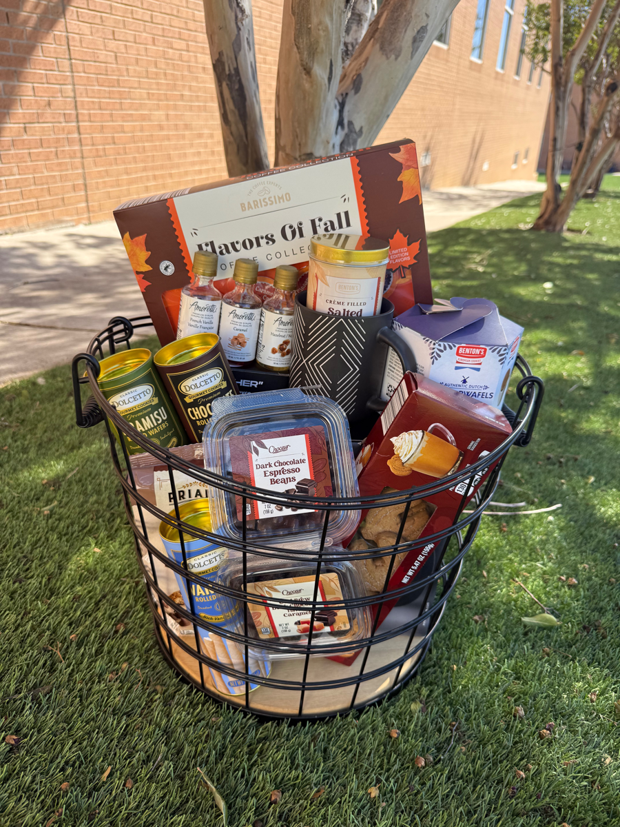 3rd grade sponsored a coffee basket to give you the jolt you are looking for. The basket includes 12 variety flavor keurig cups, french press, electric hand mixer, chocolate chip biscotti, cookie mug toppers, stroopwafels, salted caramel wafer rolls, chocolate covered espresso beans, cold brew chocolate caramels, apple pie sandwich cookies, mini coffee syrups, coffee mug, tiramisu, chocolate and vanilla rolled wafers.