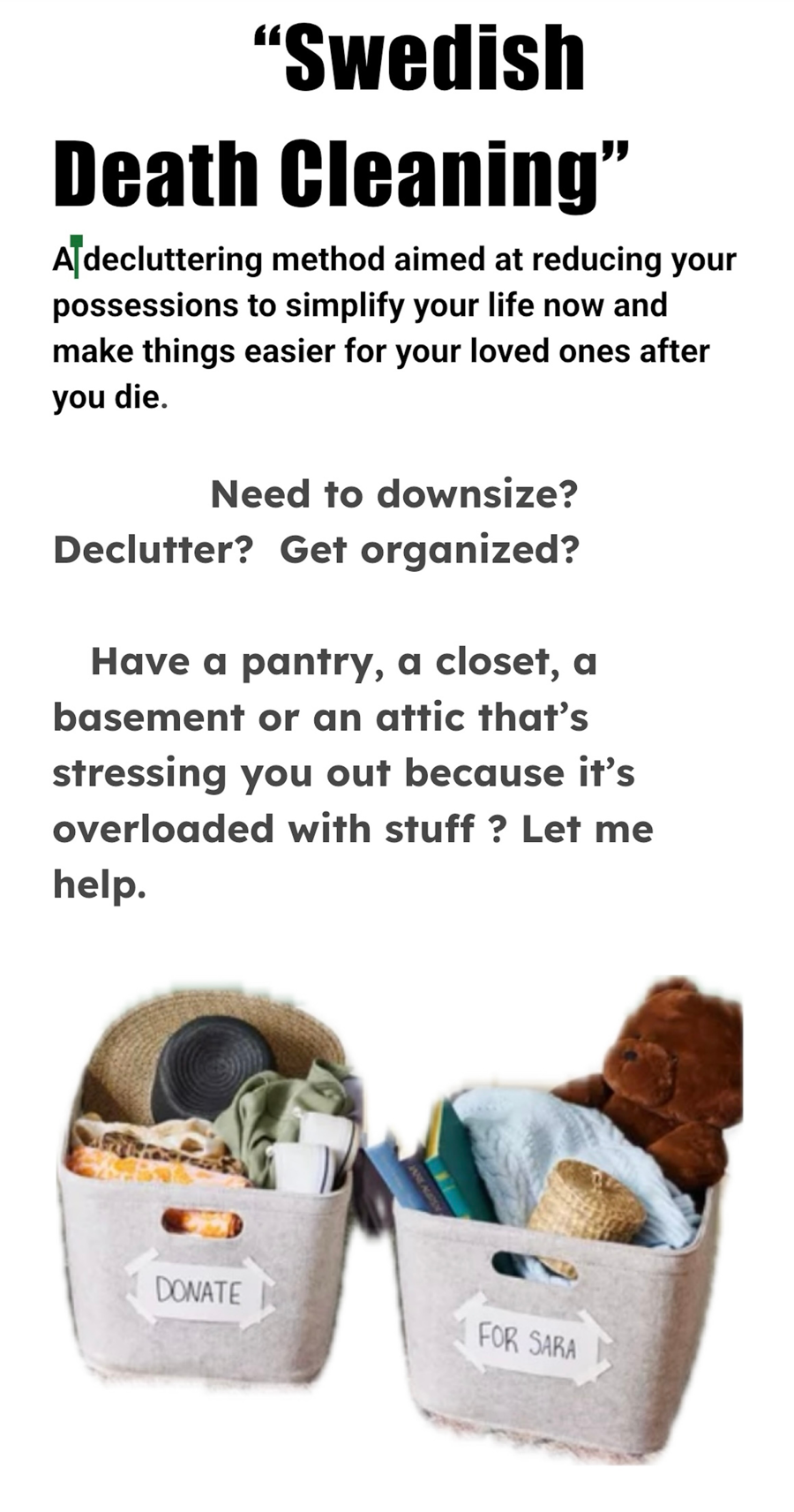 Need to downsize? Declutter? Get organized? Have a pantry, a closet, a basement or an attic that’s stressing you out because it’s overloaded with stuff ? Let me help. This is a decluttering method aimed at reducing your possessions to simplify your life now and make things easier for your loved ones after you die. Includes 4 hours of decluttering
