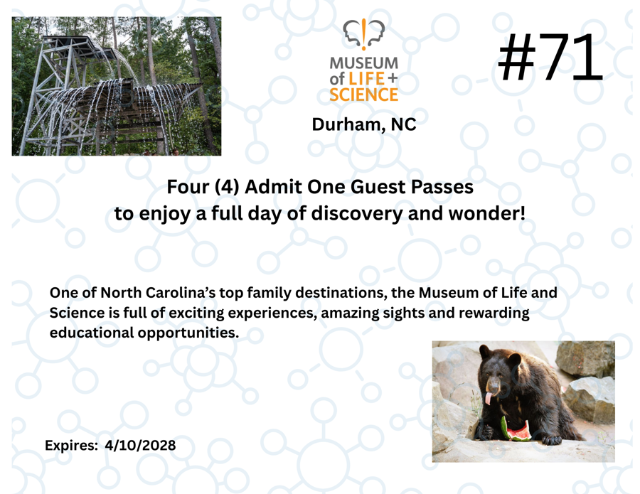 Experience a day of wonder and discovery with 4 tickets to the Museum of Life + Science in Durham, NC. This family-friendly destination offers interactive exhibits, engaging science demonstrations, and the chance to explore the great outdoors in their beautiful gardens and nature trails. Whether you're a science enthusiast or looking for a fun outing with loved ones, this museum provides an unforgettable experience. Don't miss out on the opportunity to learn and explore together with these 4 tickets!