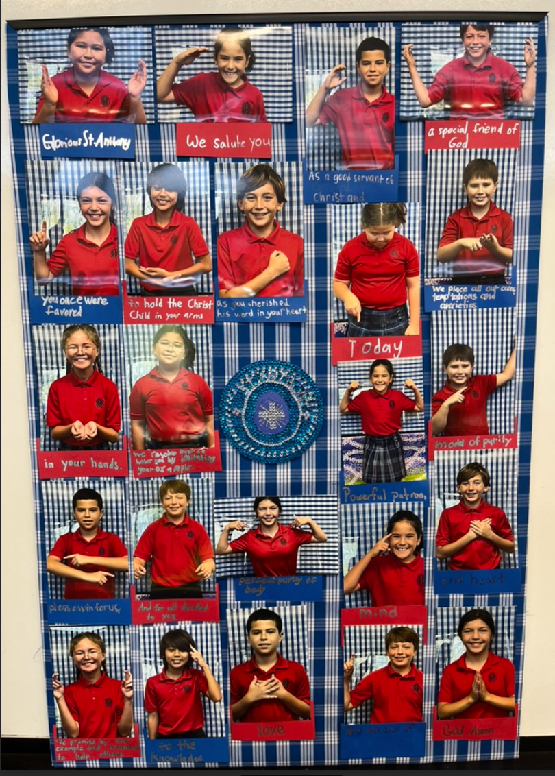 Framed picture of students showing motions of the St. Anthony prayer including written parts by students below their pictures. In the middle is our SAS school logo done in crystals. Items: Framed Class St. Anthony Prayer Picture
