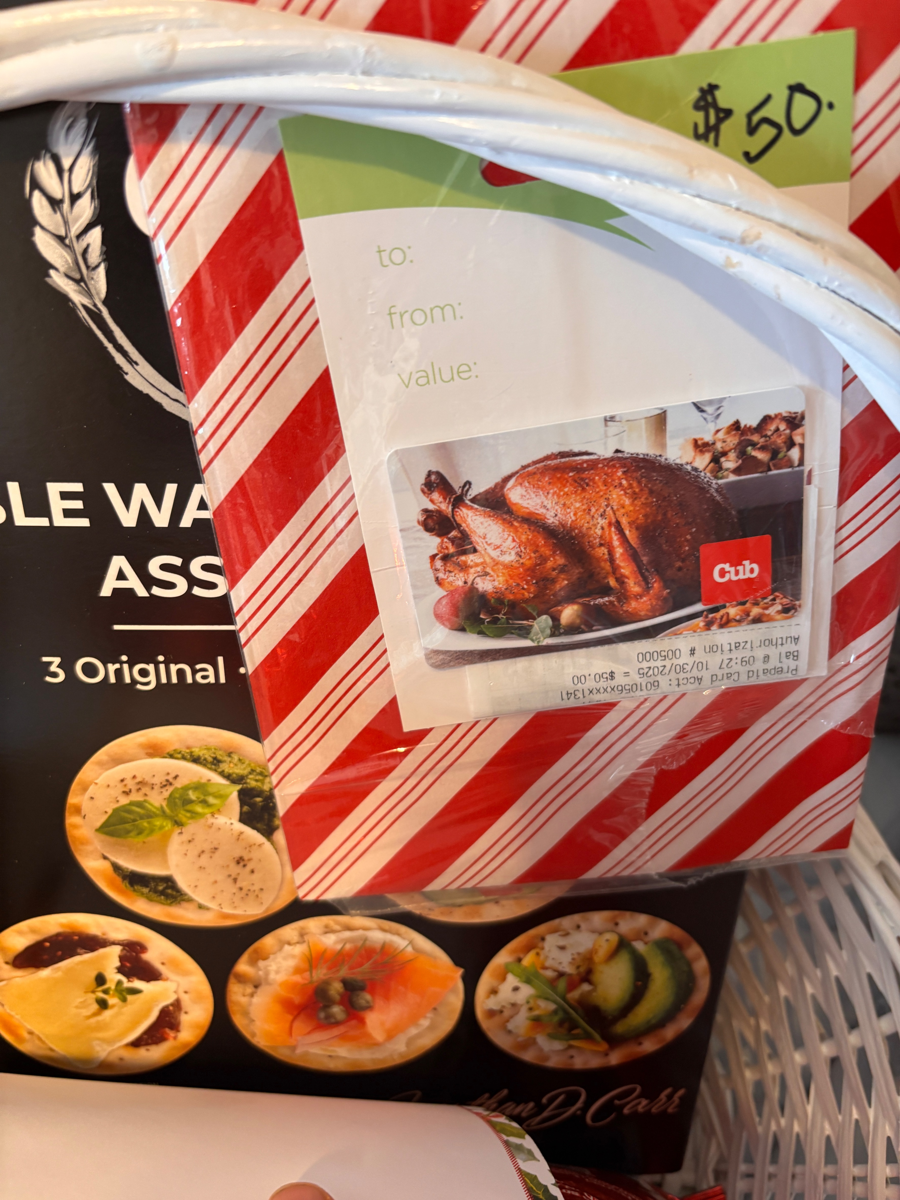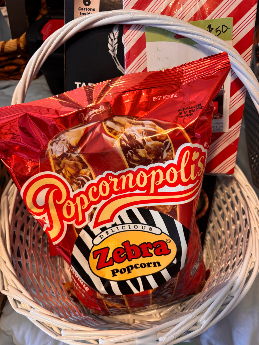 Included with the gift card are a large bag of Popcornopolis Zebra Popcorn (caramel corn with chocolate flavored stripes) and a large box of Carr's Table Water Crackers Assortment (3 original, 2 pepper, 2 sesame).