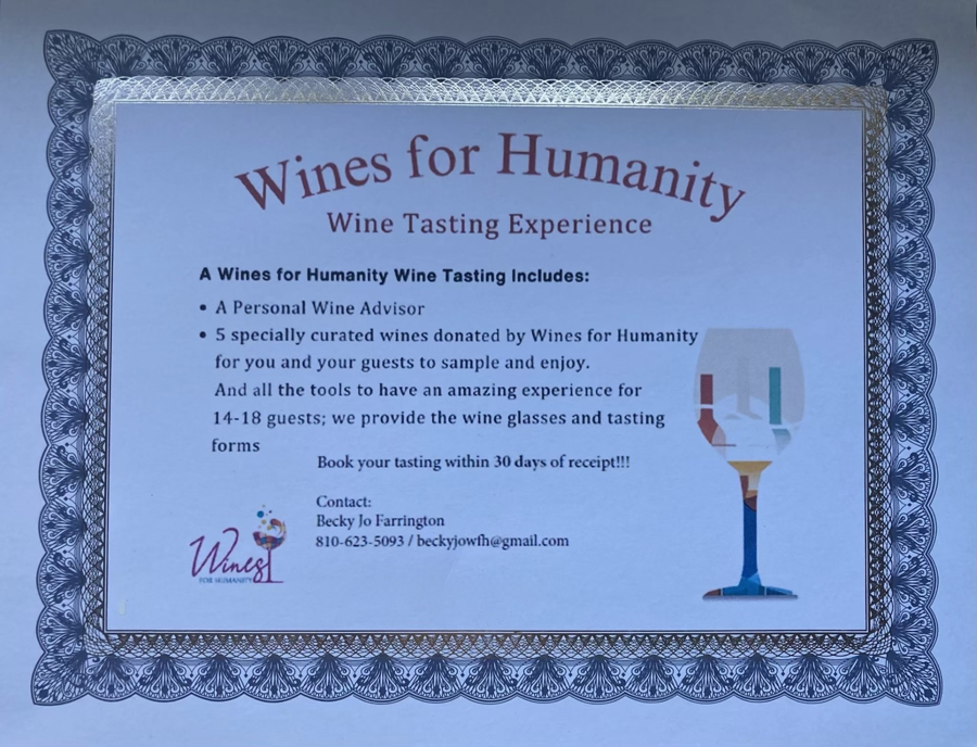 Wines for you and wines for humanity! Enjoy a fun wine tasting with friends, while raising money to be donated to a nonprofit charity of your choice. This wine tasting certificate entitles the winning bidder to an exclusive 5-bottle wine tasting event that includes three (3) red wines and two (2) white wines, accompanied by dark chocolate. A private wine advisor will contact you to schedule and hold a tasting event at your home for up to 18 people.