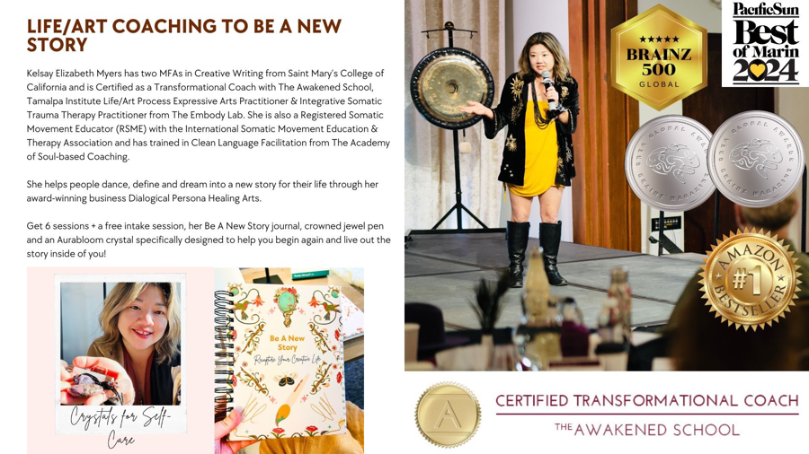 Kelsay Myers, MFA, RSME, is a published author, Certified Transformational Coach and Expressive Arts Practitioner and Registered Somatic Movement Educator living in Marin County, CA. She offers integrative trauma resolution, mental health, and personal empowerment for bold hearts on the road to transformation, embodiment and self-expression. Her work focuses on uncovering deeper layers of the self, redefining the roots and foundation of each individual's own self-expression, and recapturing their creative life for inner healing and wholeness. Kelsay helps people experience safety within themselves, increase their capacity to feel and experience more in life, and live easefully with less overwhelm, stress and anxiety, so they are free to express who they are in the world, go after their dreams and expand what they think is possible. She is donating a 6 session Life/Art Process package that includes all the benefits from her coaching program Be A New Story, as well as the swag perks: Be A New Story journal, crown jeweled pen and Aurabloom crystal to help you dance, define and dream your new story. For more info, see: https://dialogicalpersona.com/beanewstory. Email kelsay@dialogicalpersona.com or go to https://dialogicalpersona.com/bookappointment to book your free initial intake session on Zoom (in addition to the 6 sessions).